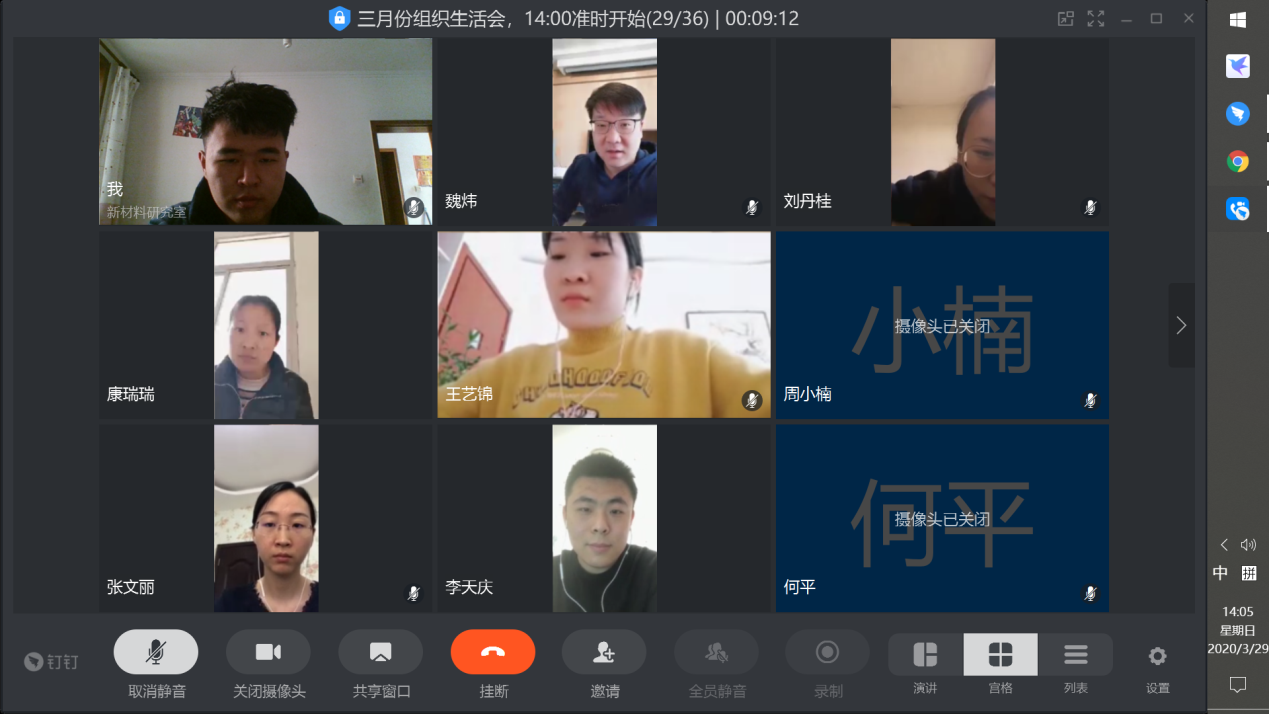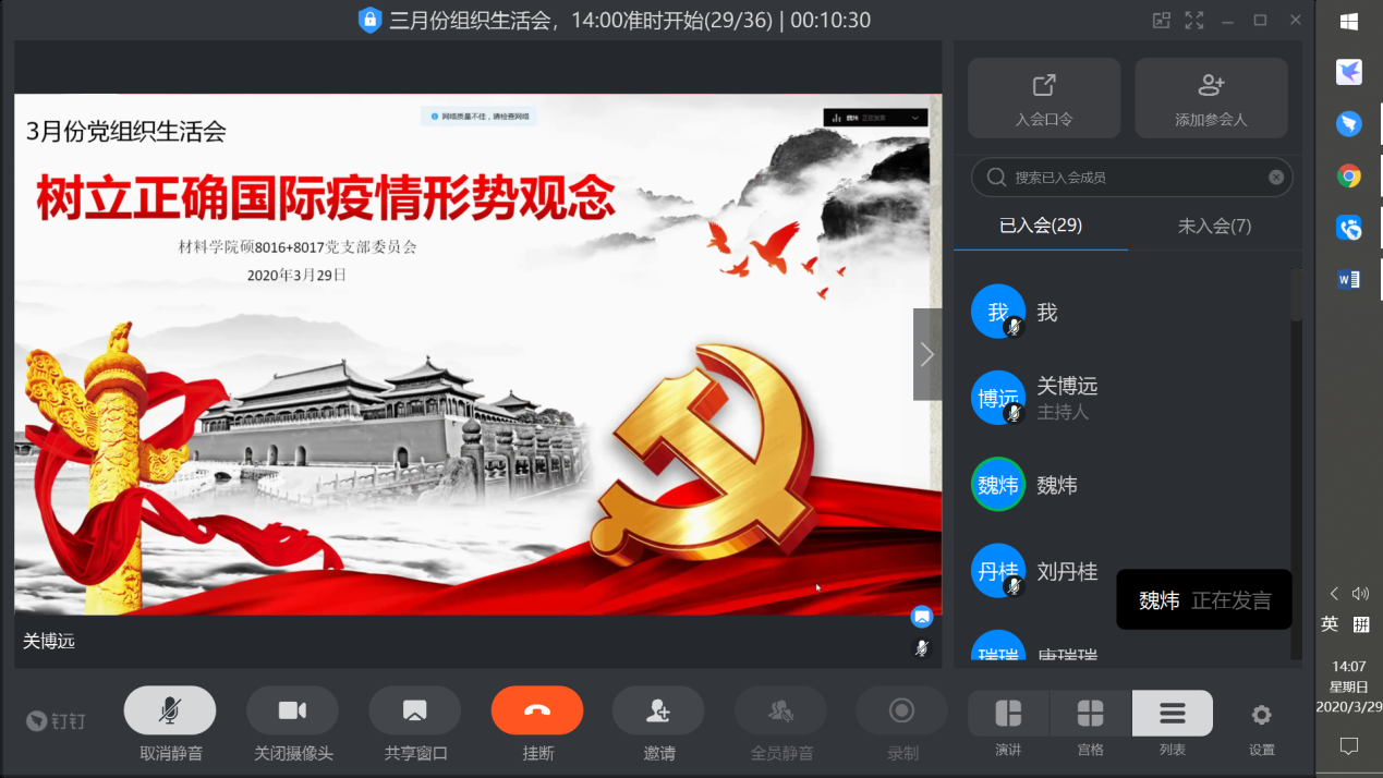 3月29日,硕8016+8017党支部开展了以“树立正确国际疫情形势观念”为主题的支部生活会。受疫情限制,此次会议依然采用了以钉钉为平台的线上会议模式。会议由支部书记关博远主持,支部党员、积极分子参与了会议;会议特别邀请了材料学院副书记魏炜 、辅导员黄小燕以及9016+9018党支部支委参加。