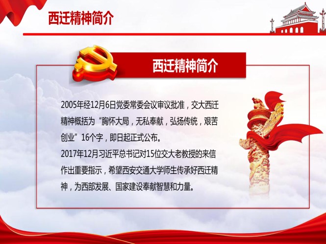 接着西迁精神宣讲团成员余杨带领大家学习西迁精神,讲述西迁的重要性和必要性。从南洋公学到交通大学,再到1955年西迁,直到近年来交大的发展,交大为国家、为西部做出了巨大贡献。勉励大家牢记老一辈交大人的奉献精神,争做西迁精神传承人。