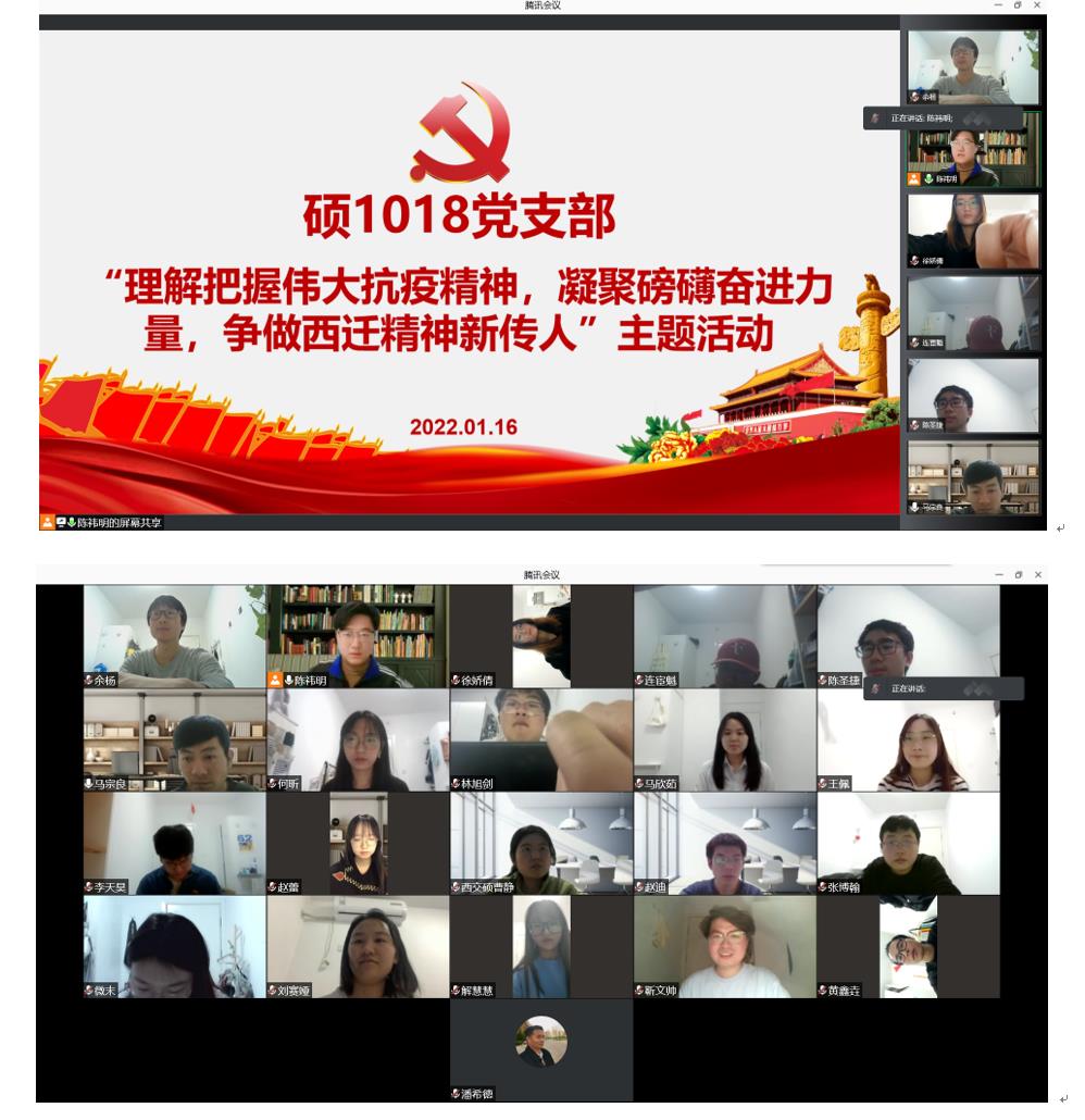 1月16日晚7点,硕1018党支部在线上开展党日主题活动——“理解伟大抗疫精神,凝聚磅礴奋进力量,争做西迁精神新传人”。会议旨在充分发挥党支部战斗堡垒作用和党员的先锋模范作用,保障教学科研等工作平稳运转。支部全体党员和积极分子参加本次会议,会议邀请材料学院党委书记潘希德同志参会指导,会议由硕1018党支部书记陈祎明同志主持。
