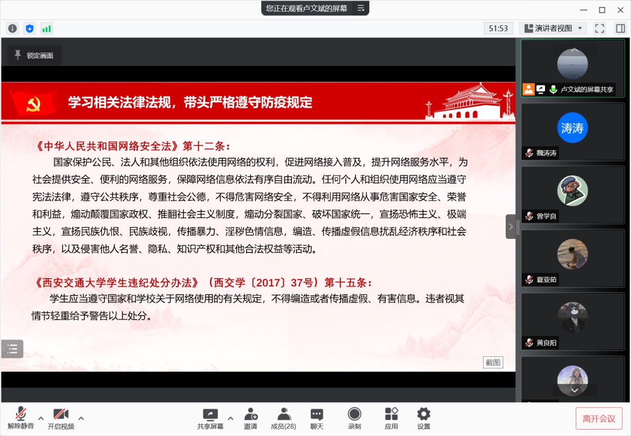 同学们学习了解了《中华人民共和国网络安全法》中关于公民在互联网上的言论自由权利和应当遵守的相关规定,以及《西安交通大学学生违纪处分办法》中关于网络使用的有关规定。在之后的讨论中,同学们纷纷表示面对疫情期间的一些消息要理性对待,同时要积极响应防疫政策,配合疫情防控人员的相关工作。