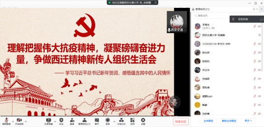 2022年1月17日,材料学院S0023党支部召开了以“学习习近平总书记新年贺词,感悟蕴含其中的人民情怀”为主题的线上组织生活会议,S0023党支部党员及积极分子共计20人参加本次会议,会议由吴建鹏同志主持,材料学院党委委员孙巧艳同志参会。