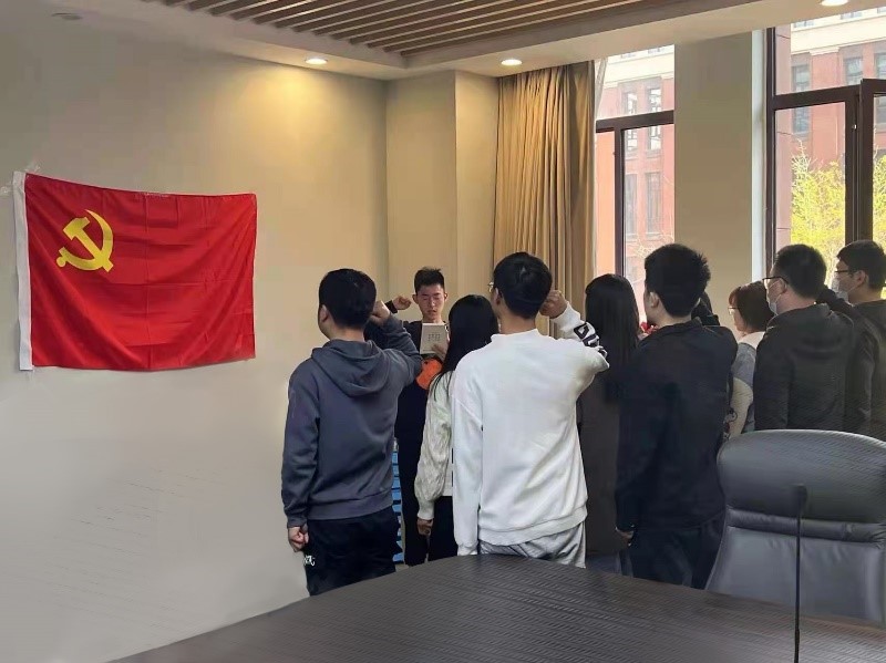 会议最后,支部全体成员再次站在了党旗下,由支部委员郑泽华领誓,同志们再次郑重地宣誓。