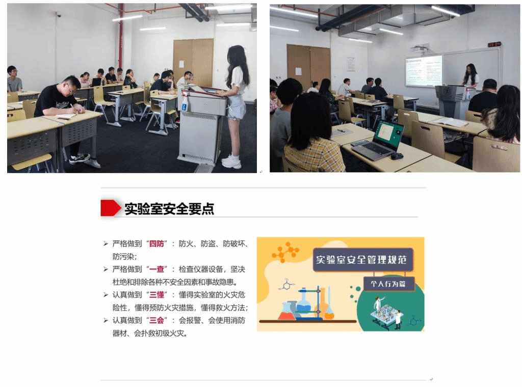 首先陈诗萌同学以实验室安全的重要性为主题,从实验室环境、设备、人员等方面可能存在的问题出发,并结合近两年来各大高校、研究机构发生的一系列实验室安全事故进行了详细的分析。紧接着马珲同学以学校、学院提供的安全保障为主题,分别从实验室的安全制度管理、环境监管和安全检查、安全教育、实验室安全生产月几个方面介绍了学校、学院有关实验室安全的政策和活动,他强调广大学生必须要树立良好的安全意识。最后,陈小雨同学以实验室安全从自身做起为主题,她指出实验室安全要做到“四防一查三懂三会”——严格做到“四防”:防火、防盗、防破坏、防污染;严格做到“一查”:检查仪器设备,坚决杜绝和排除各种不安全因素和事故隐患。认真做到“三懂”:懂得实验室的火灾危险性,懂得预防火灾措施,懂得救火方法;认真做到“三会”:会报警、会使用消防器材、会扑救初级火灾。在实验过程中务必要遵守实验规定、熟知安全常识、不冒险作业、遇到问题及时报告,若遭遇突发事故,一定要第一时间撤离,保护好自身安全。