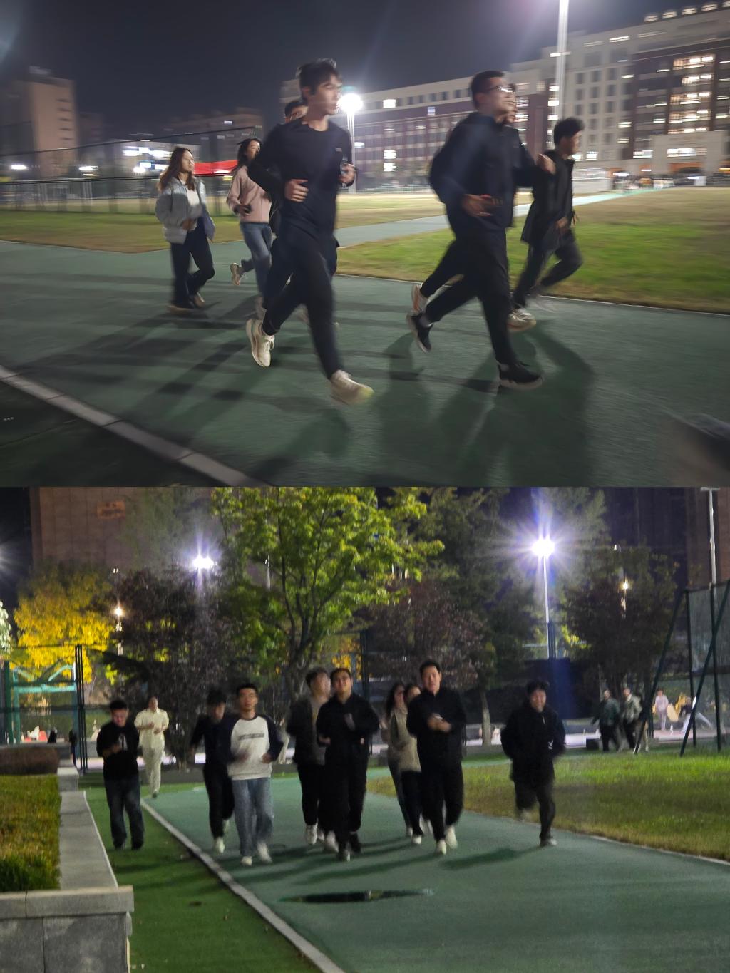 在同学们夜跑前的准备中、跑步时的呼吸声中和跑后淋漓的汗水里,体现了互相的坚持与力量,大家从小事做起,以实际行动诠释当代青年素养。