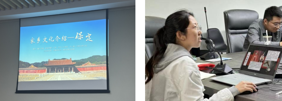 在接下来的“家乡文化”分享环节,徐虹钰和张紫妍同学为大家带来了各自家乡的风情介绍。徐虹钰从广元市的特色节日、传统戏剧和地方美食切入,讲述了家乡的女儿节、傩戏等传统习俗,浓厚的乡土情怀让大家对广元的文化多了一份亲切感。张紫妍分享了保定的悠久历史和丰富文化,带大家领略了这座燕赵文化发源地的风采,使同学们对保定的历史与文化有了更深入的了解。两位同学的讲解不仅让大家对不同地域文化有了更多的了解,还拉近了彼此的距离,激发了大家对中华传统文化的认同与归属。