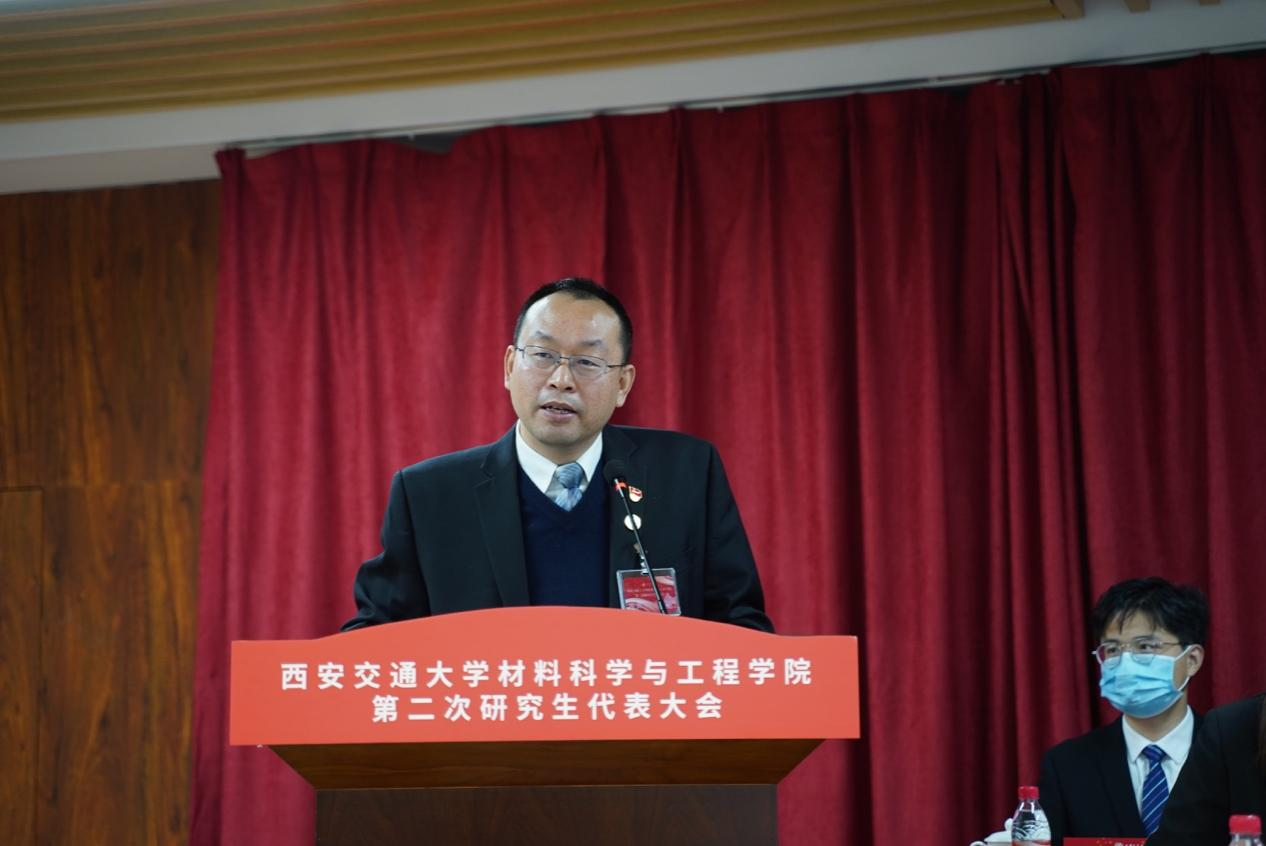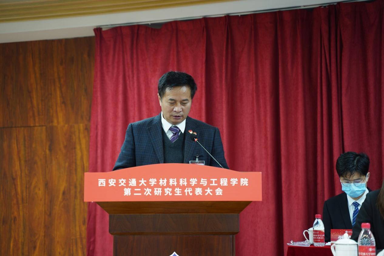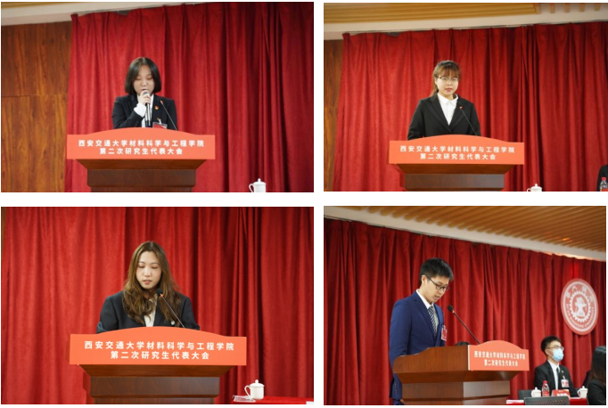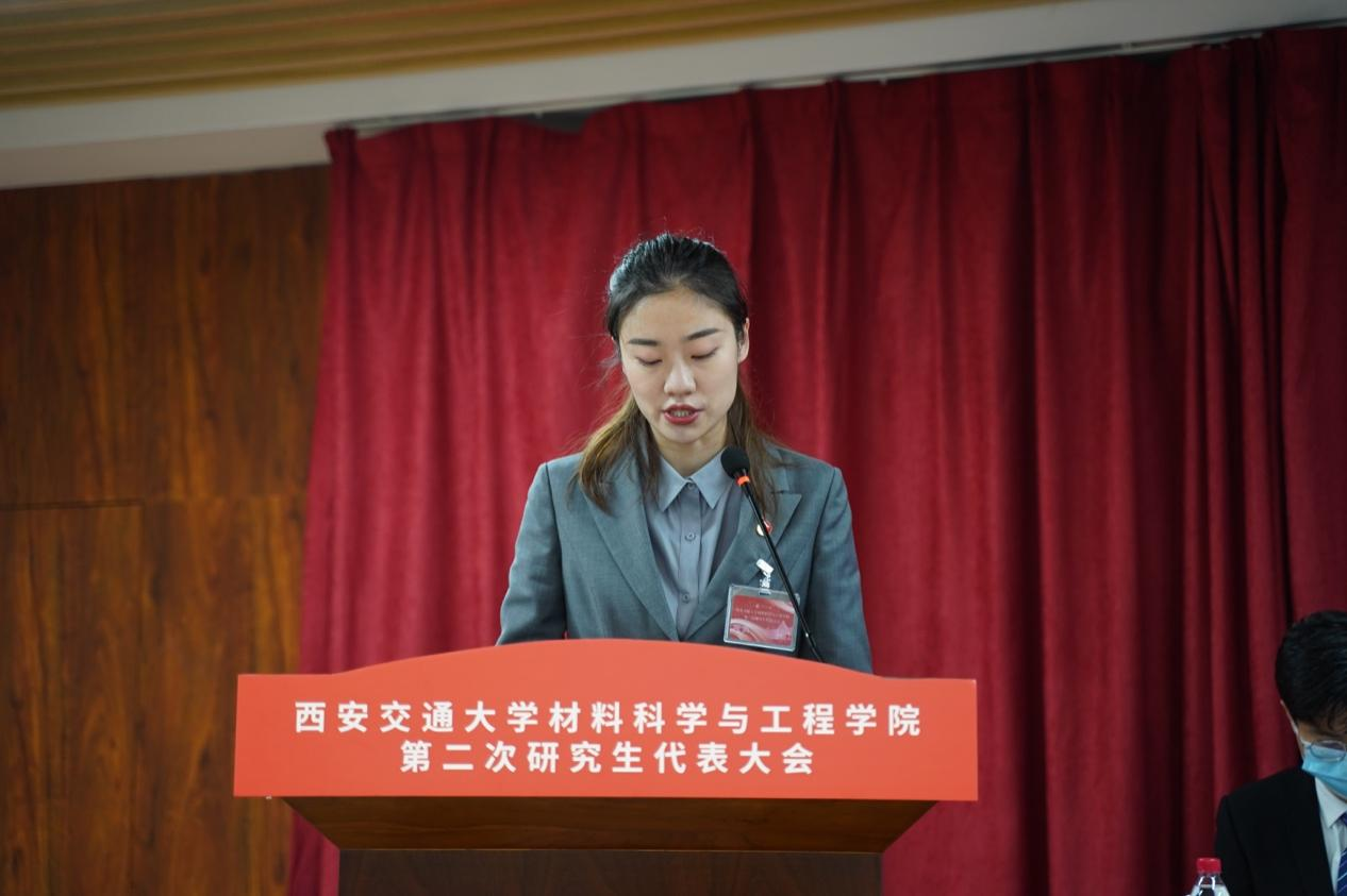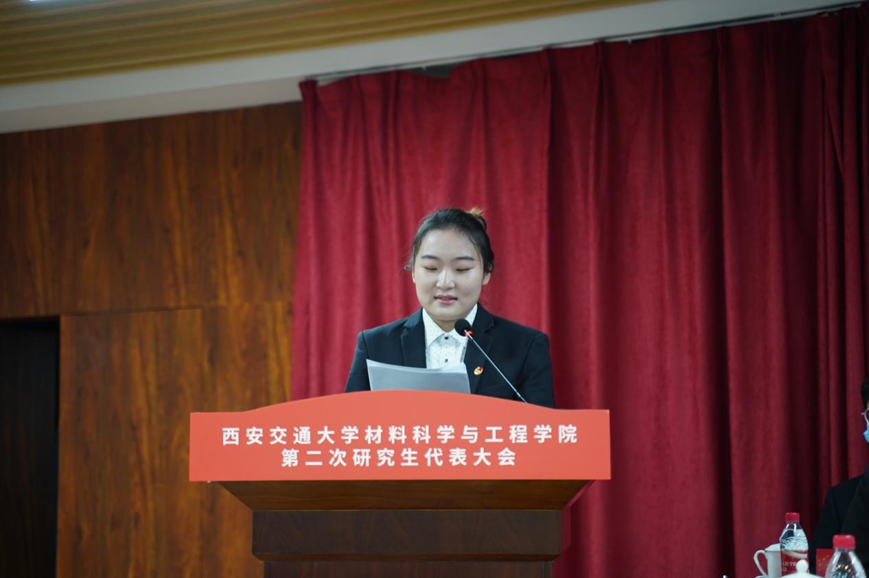 王雅雯代表西安交通大学研究生会对材料学院第二次研代会的召开表示祝贺,充分肯定了材料学院研究生分会过去一年的工作,并对分会提出了三点希望:一是要坚持党的领导,在加强思想政治引领方面取得新的成效。二是要始终牢记服务宗旨,在服务同学成长成才方面取得新进步。三要贯彻落实相关组织规定,在改革和自我建设方面取得新进展。