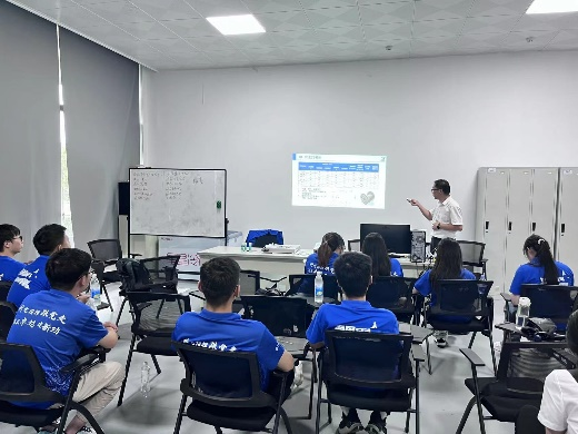 在后续的实践活动中,中天钢铁淮安公司技术中心副主任、西安交大材料学院2001级校友李晓军向大家介绍了半成品生产工艺流程及其相关原理;工程师孙琳介绍了湿拉工艺流程及其相关原理;技术中心副主任刘兴华介绍了钢帘线工序分类、产品性能检测方法和智能化生产设备及其原理等相关内容。通过专业讲解,实践团队更加深入地了解了钢帘线产品,学以致用、知行合一,在接下来参观生产车间的过程中能够更加有效地将理论知识与实际生产过程相结合。