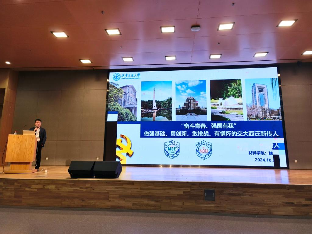 魏炜老师向2024级研究生传达了深切的期望,希望他们能够传承西迁精神,具备坚实的学术基础、勇于创新的精神、敢于面对挑战的勇气和深厚的人文情怀。在介绍材料学院在基层党建、文化建设、就业创业、知心工程等方面的相关情况后,他对新生提出了三点期望:一是培养社会能力,提升社交能力和团队协作精神;二是探索研究方法,寻找适合自己的学术路径;三是追求社会价值,通过积极参与解决社会问题来承担社会责任。