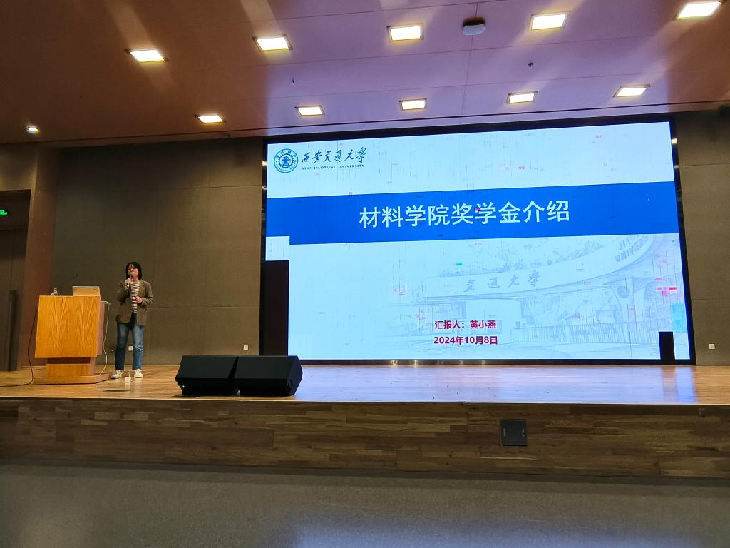黄小燕老师向同学们详细介绍了奖助金体系,包括奖学金的申请资格、评定办法以及“三助一辅”岗位等相关情况,鼓励学生们在学术研究、创新实践、社会服务等多个领域追求卓越、全面发展,成为拥有远大理想、坚定意志和奋斗精神的材料学子。