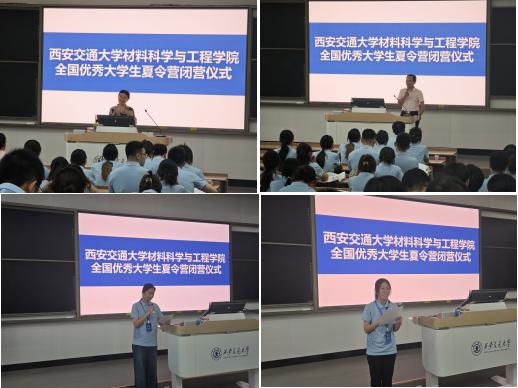 在闭营仪式上,王红洁副院长总结了夏令营期间丰富多彩的各项活动,对营员们展现出的高度参与热情与积极态度给予了充分肯定,并鼓励大家要始终永葆求知之心,锤炼坚韧之志,胸怀家国之责。随后,马飞副院长作为研究生导师代表发言,他希望同学们能满怀热忱地选择交大这片科研沃土,潜心钻研,与交大携手共进,共同为材料学科的蓬勃发展贡献出属于交大人的坚实力量。来自四川大学的郑涵卓同学和来自中央民族大学的姜心怡同学作为营员代表发言,他们表示通过参加材料学院夏令营,深感交大学术氛围浓厚,此行收获满满,更加坚定了投身材料科学领域研究的决心。