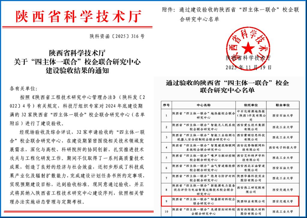 近日,陕西省科学技术厅公布了2024年底建设期满的32家“四主体一联合”校企联合研究中心以下简称“研究中心”的验收结果。由西安交通大学材料学院与陕西锌业有限公司联合组建陕西省“四主体一联合”锌基新材料校企联合研究中心顺利通过验收验收批复文件:陕科资函〔2025〕316号,正式纳入陕西省工程技术研究中心建设序列。这标志着双方在锌基新材料领域的产学研协同创新与深度融合发展取得重要突破。