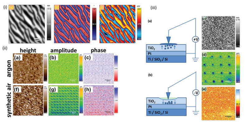 图二则包括了(i)压电力显微镜在驰豫铁电材料上成像;(ii)电化学应变显微镜技术在NiO薄膜上的成像;(iii)电化学应变显微镜技术在TiO2薄膜上的成像。