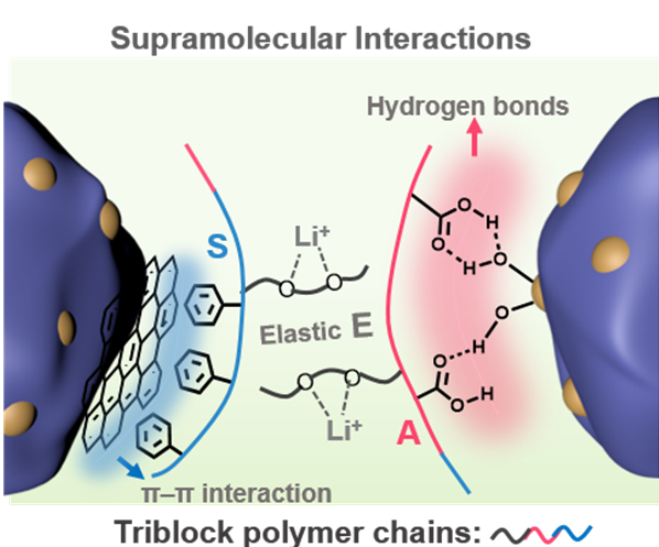 此外,课题组针对锂离子电池新一代高比容硅碳负极开发了一种界面适应型粘合剂解决因其大体积形变导致的容量快速衰减难题。所开发的三嵌段聚合物粘合剂PSEA由疏水的聚苯乙烯嵌段(S)、弹性的聚(2-(2-甲氧基乙氧基)乙酯(E)嵌段和亲水的刚性聚丙烯酸嵌段组成。与传统的硅基负极粘合剂不同,新型界面适应型粘合剂能够通过π∙∙∙π堆叠和氢键相互作用与C层和Si层结合,有效地促进界面粘附以及电极各组分在浆料中的均匀分散,进而维持电极组颗粒间的连接和电极的完整性。此外,粘合剂中柔性的聚醚侧链及其丰富的配位位点还可以促进聚合物链中锂盐的解离,加速Li+传输。得益于此,即使高面容量下,所制备的硅碳负极仍表现出优异的电化学循环性能。相关工作以《基于超分子相互作用的界面自适应粘合剂在锂离子电池高比容硅碳负极中的应用》(Interface-Adaptive Binder Enabled by Supramolecular Interactions for High-Capacity Si/C Composite Anodes in Lithium-Ion Batteries)为题发表在国际知名期刊《先进功能材料》(Advanced Functional Materials)上,材料学院博士生虎琳琳为本文第一作者。该成果是团队继梯度应力耗散型粘合剂(Advanced Materials, 2021, 33, 2104416)、自修复和应力耗散双功能聚合物粘合剂(Advanced Functional Materials, 2020, 31, 2005699)之后的又一重要进展。