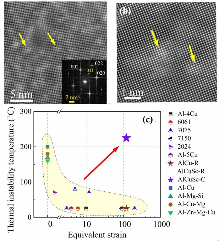 图1 (a, b) 纳米晶AlCuSc-C合金中(Cu,Sc,空位)原子复合体的HAADF照片,以及(c) 本合金中热失稳温度(时效50h发生相分离的临界温度)与等效应变(代表晶粒尺寸大小)的对应关系,及其与前人报道的粗晶和常规大变形超细晶、纳米晶铝合金相关数据之间的对比