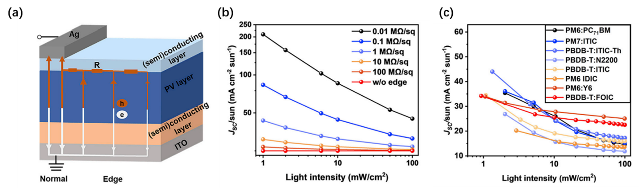 西安交通大学金属材料强度国家重点实验室赵超博士和马伟教授分析认为,决定电学边缘贡献的关键物理参数是电压分布而不是电阻。随着光照强度降低,光电流减小,器件边缘的电压分布变宽,有效边缘面积增大,导致器件的有效面积增大,造成弱光下Jsc高估。基于上述分析,研究团队提出等效电路模型,以研究光照强度和器件表面电阻对电学边缘效应的影响。计算和实验结果表明,当界面电阻为1MΩ/sq时,在标准光照下(1 sun),边缘效应很小;然而,在低光照下(0.01 sun),边缘效应将导致Jsc高估>70%,PCE高估>22%。该机制适用于所有类型的光伏器件,包括有机太阳能电池,钙钛矿太阳能电池,染料敏化太阳能电池。此外,电学边缘效应通常被认为只发生在具有导电层的器件中,本研究揭示非导电层的界面掺杂也能造成明显的电学边缘效应:在0.01 sun光照下,Jsc高估51%,PCE高估15%。相比导电界面层,界面掺杂引起边缘效应从未被关注,也极易被忽视。进一步地,研究团队发现随着表面粗糙度的增大,界面电阻减小,导致更强的边缘效应。基于以上结果,研究团队提出增加器件的有效面积、降低表面粗糙度、使用掩膜、设计无边缘器件结构,以避免电学边缘效应导致Jsc高估和PCE高估。该工作为电学边缘效应的内在机制及其对器件性能评估的影响提供了新见解,有利于促进室内光伏器件研究领域的健康发展。