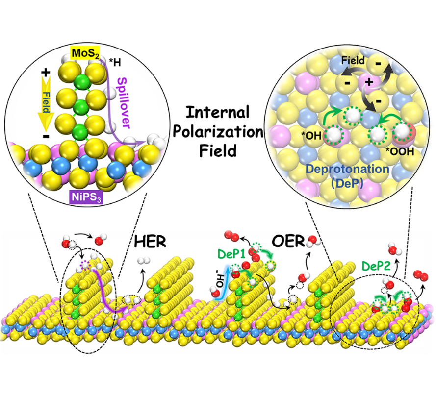 近日,西安交通大学材料学院戴正飞特聘研究员与南京理工大学曾海波教授针对上述问题开展合作研究,设计并构建了一种全过渡金属基MoS2/NiPS3垂直异质结构,以协同加强HER氢溢流和OER去质子化过程,实现高效的全分解水。内建极化场(Internal Polarization Field, IPF)被认为是氢溢流和去质子化的驱动力。从MoS2边缘到NiPS3的氢溢流同时激活了NiPS3基面,从而提高了异质结构的HER活性(112 mV vs. RHE,10 mA cm–2)。对于OER,异质结构中的内建极化场IPF可以促进羟基扩散并形成MoS2-to-NiPS3和NiPS3基面上P-to-S的双去质子化通道,提升性能。将异质结构用作电极对,在施加1.64 V的电压时即可达到10 mA cm–2的电流密度,并稳定运行100 h。同时,该催化剂具有接近理论水平的全解水法拉第效率(~99%)。本研究提出以内建极化场作为合理设计氢溢出/去质子化统一的非贵金属电解水催化剂的标准,为催化剂的双功能化提供思路。