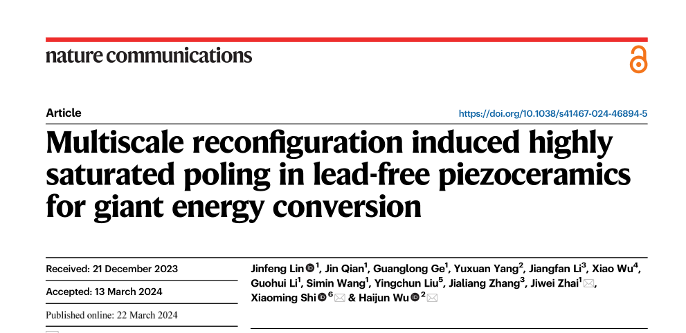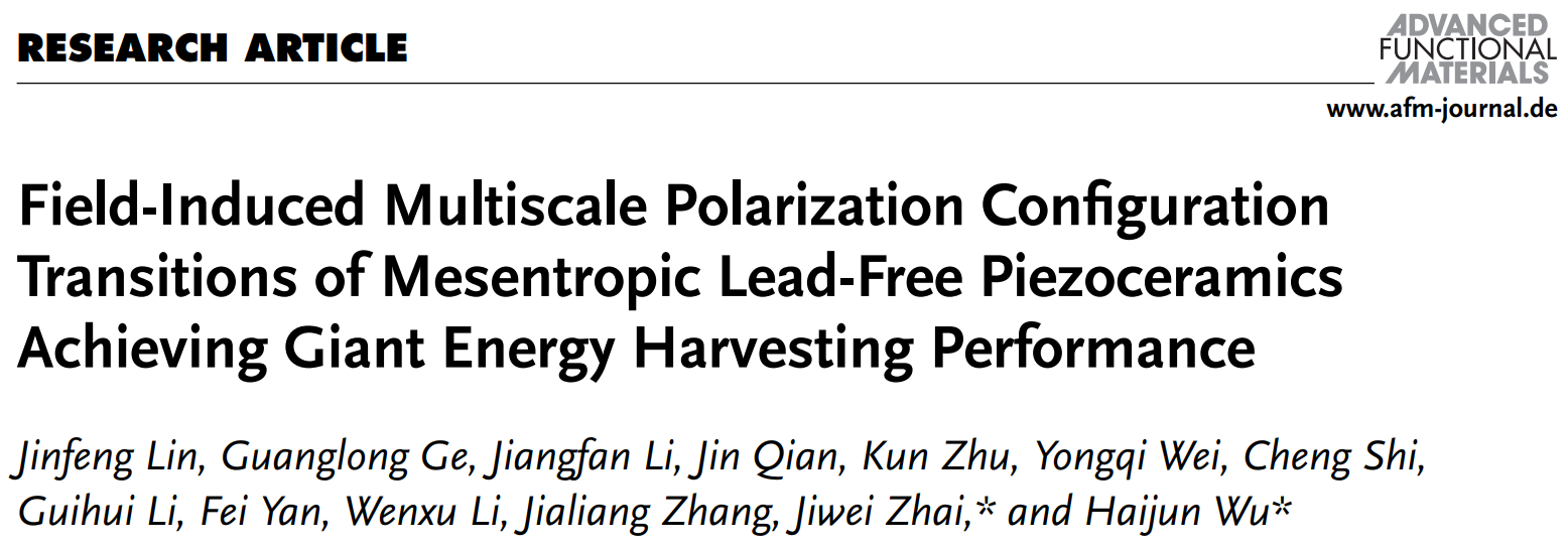 相关成果以“Multiscale reconfiguration induced highly saturated poling in lead-free piezoceramics for giant energy conversion”(《多尺度重构诱导无铅压电陶瓷高度饱和的极化,实现了巨大的能量转换》)为题发表在《Nature Communications》上;相关成果以“Field-Induced Multiscale Polarization Configuration Transitions of Mesentropic Lead-Free Piezoceramics Achieving Giant Energy Harvesting Performance”(《场诱导多尺度极化构型转变调控无铅无压电陶瓷的亚稳相状态,实现了巨大的能量收集性能》)为题发表在《Advanced Functional Materials》上。这两篇工作的通讯作者是同济大学的翟继卫教授和西安交通大学的武海军教授。感谢西安交通大学分析测试中心在球差校正电镜表征的支持。
