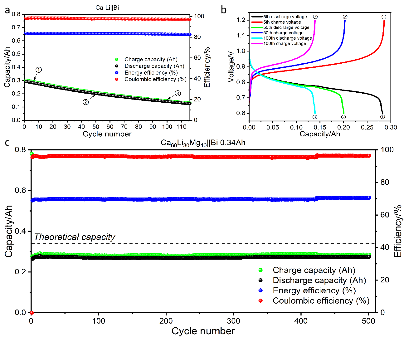 研究团队构建并测试了不同比例(10:90、20:80、30:70、40:60、50:50和60:40 mol%)的Ca-Li合金作为负极的Ca-Li||Bi液态金属电池,其中以60:40 mol%为例,如图二(a)(b)所示,无论Ca-Li合金的具体成分如何,电池的容量衰减均相当显著。通过引入镁作为惰性添加剂,可以有效地抑制电池容量的衰减。镁的作用主要是在不参与电池的电化学反应机制的同时,稳定地粘附在负极集流体上。这种特性使得电池的容量衰减与负极集流体的特性紧密相关。因此基于上述的方法和模型,本研究最终筛选出了循环性能目前最优的液态金属电池,分别为Ca65Li30Mg5||Bi、Ca60Li35Mg5||Bi和Ca60Li30Mg10||Bi液态金属电池。其中以具有最佳长循环稳定性的Ca60Li30Mg10||Bi液态金属电池为例,如图二(c),Ca60Li30Mg10||Bi 电池显示出最佳的长周期稳定性,即使在第500个周期也能保持接近100 %的容量,库仑效率约为97 %,能量效率约为71 %。在第100 个循环时,自放电电流密度约为2.79 mA/cm2。综上所述,Ca60Li30Mg10||Bi液态金属电池具有最佳的长循环稳定性,是一种极具吸引力的储能候选技术。