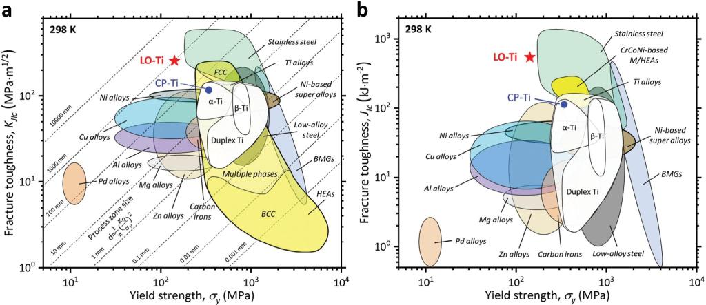 钛及钛合金作为一种轻质、高强、耐腐蚀的金属材料,被广泛应用于航空航天、海洋工程和生物医用领域。近年来,随着“损伤容限”设计理念在工业界的不断推进,对钛的断裂韧性的要求也日益提高。然而,经过数十年的合金化设计和加工工艺改进,钛及钛合金的断裂韧性始终低于130 MPam1/2低于一些奥氏体不锈钢和面心立方结构的/高熵合金(断裂韧性超过200 MPam1/2)。这种断裂韧性的不足限制了钛及钛合金在一些关键负载条件下的应用。人们不禁要问钛及钛合金的断裂韧性仅能达到130 MPam1/2
