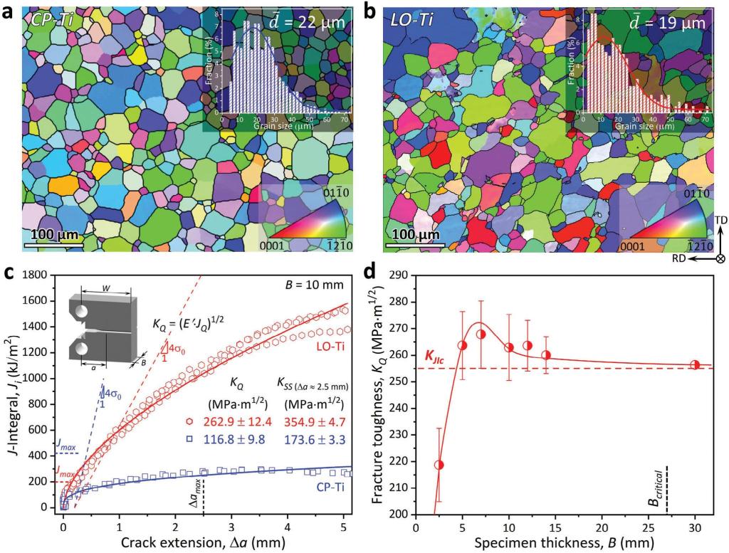 1 商业纯钛和低氧钛的初始结构与断裂韧性测试。通过对厚度为2.5 mm30 mm的低氧钛样品开展标准CT样断裂韧性测试,发现其满足平面应变条件的断裂韧性值(KJIc)达到255 MPam1/2