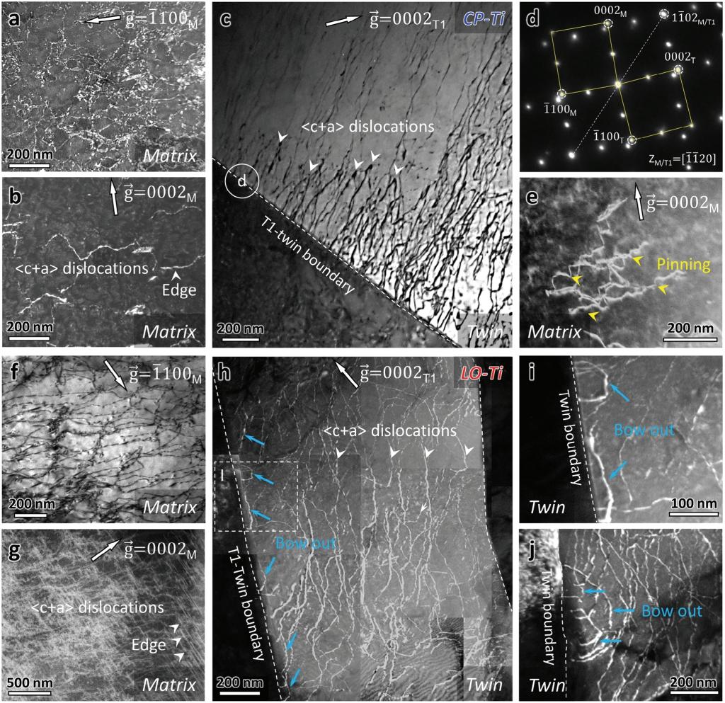 研究人员发现,氧杂质含量的显著降低成功克服了密排六方结构金属钛在室温条件下<c>轴变形模式难以启动的难题,并发现了一种全新的递进韧化新机制:降低氧含量不仅促进了裂纹尖端变形孪晶的大量激活(如图3),还发现孪晶界作为高效位错源,发射了大量的<c+a>位错(如图4),有效克服了<c+a>位错自增殖的困难。这两种在室温下通常难以启动的变形模式的大量激活,显著提升了低氧钛裂纹尖端的均匀变形能力、变形密度和塑性区尺寸,从而有效钝化了裂纹尖端,使金属钛展现出了前所未有的断裂韧性。这种全新的韧化机制及降低关键杂质含量的研发策略,为设计高损伤容限钛合金提供了新思路。