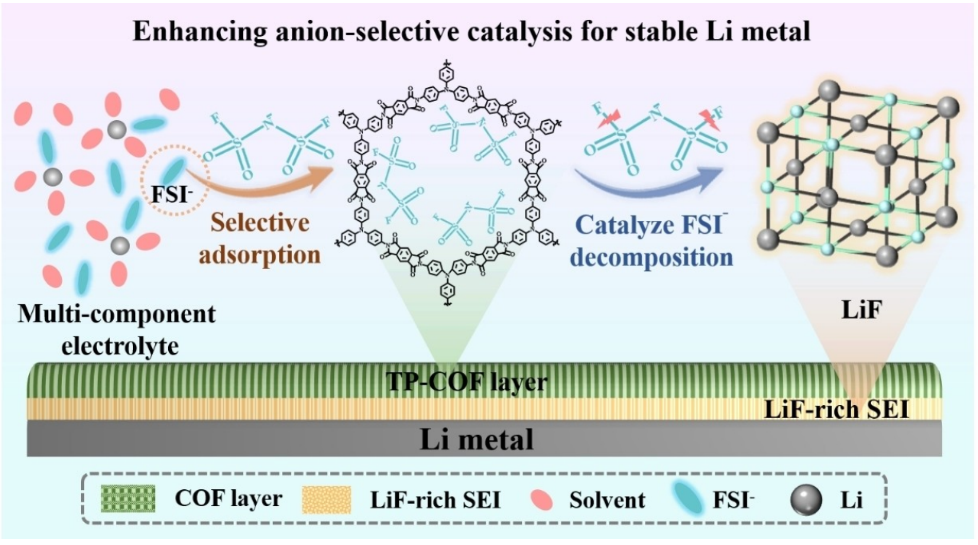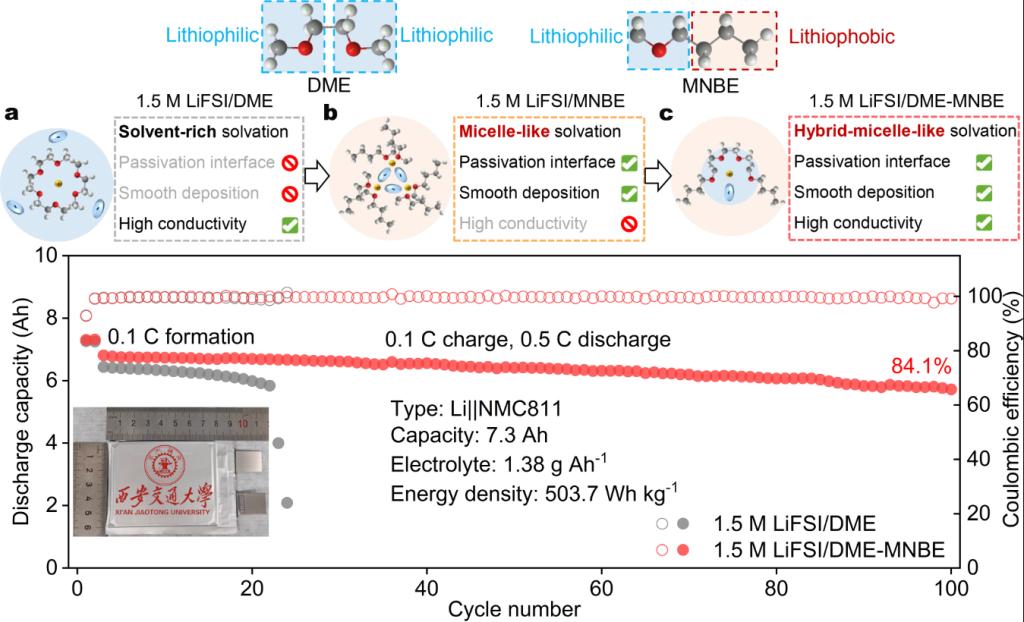 宋江选教授团队面向国家重大能源需求,开展高比能二次电池关键材料研究。近期,团队针对锂金属电池界面稳定性差、锂枝晶生长严重以及体相离子传输缓慢等问题,分别提出了电荷分离COF中间层增强阴离子选择性催化界面的新策略和无氟类胶束电解液设计的新思路。通过COF界面诱导分解以及富阴离子溶剂化结构调控等手段,构建了坚韧的富无机组分固态电解质界面膜,实现了500 Wh/kg超高比能锂金属软包电池稳定循环,为锂金属电池的产业化发展提供了重要支撑。相关成果分别以《通过电荷分离 COF 中间层增强阴离子选择性催化作用实现长寿命锂金属软包电池》(Enhancing Anion-Selective Catalysis for Stable Lithium Metal Pouch Cells through Charge Separated COF Interlayer) 为题发表在国际权威期刊《德国应用化学》(Angewandte Chemie International Edition) 上,西安交通大学材料学院博士生赵培钰(已毕业)和张艳华为本文共同第一作者;以《用于超高能量密度锂金属电池的无氟类胶束状溶剂化电解质》(Non-fluorinated Electrolytes with Micelle-like Solvation for Ultrahigh Energy Density Lithium Metal Batteries) 为题发表在国际权威期刊《化学》(Chem) 上,西安交通大学材料学院博士生乔睿和赵严副教授为本文共同第一作者。
