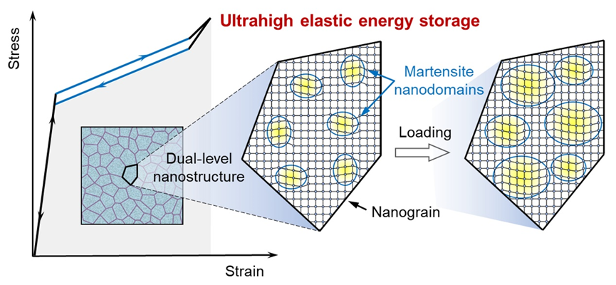 针对这一问题,西安交通大学材料学院强度室科研人员提出了一种“双级纳米结构”微观设计策略,旨在形状记忆合金中实现优异的弹性储能。该策略如图1所示,通过构建预存纳米马氏体畴的纳米晶结构,基于无需形核的相变模式和晶界强化效应,同时实现高屈服强度、大弹性应变和低能量耗散。所开发的新型TiNiV形状记忆合金表现出超高弹性储能密度(> 40 MJ/m3)、能量效率(> 94%)以及优异的抗疲劳性。这种通过预先引入“相变种子”降低一级相变过程中的能量耗散,并利用晶粒细化提升材料强度,最终提升材料弹性储能的设计思路,有望拓展至其他相变体系,启发基于固态相变的其他功能特性的进一步优化,比如高介电储能、高效弹热制冷等。