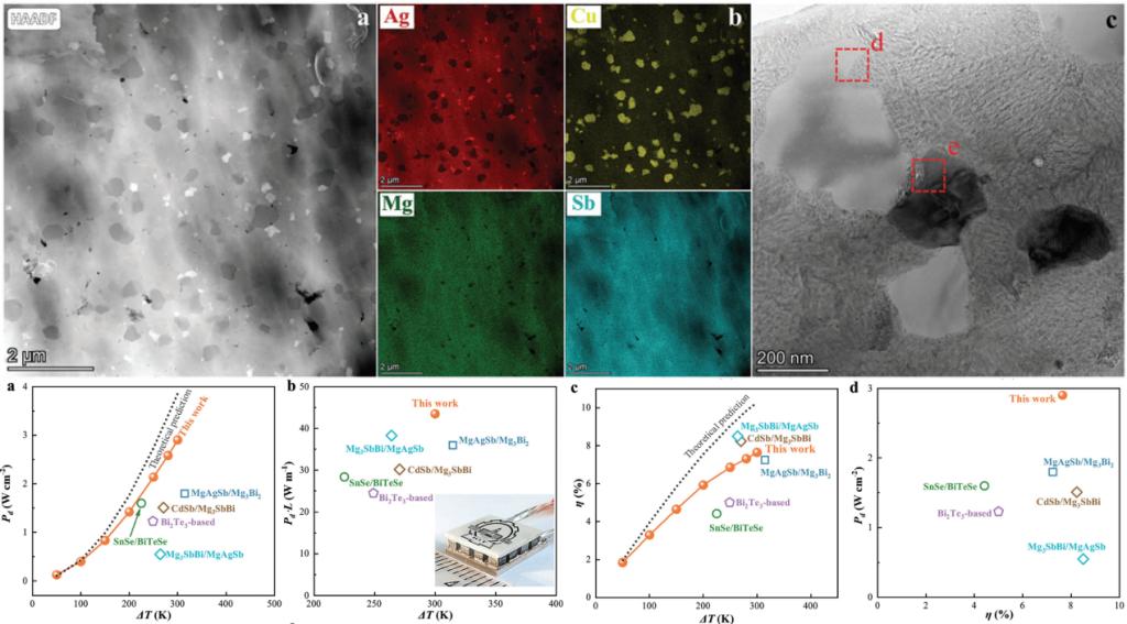 近日,该合作团队基于该复合策略做进一步研究。持续的热电研究集中于提升发电机的转换效率,而同时实现高输出功率仍显不足。特别是,目前报道的基于Mg的模块的最高输出功率密度仅为商用Bi2Te3模块的一半,主要归因于MgAgSb的低功率因子。在本研究中,MgAgSb基体中均匀分布的MgCuSb原位析出纳米颗粒,由于金属-半导体欧姆接触的载流子注入效应,有效优化了载流子浓度。因此,在300-550 K的温度范围内,MgCu0.1Ag0.87Sb0.99复合材料实现了创纪录的平均功率因子27.2 μW cm1 K2,远高于MgAgSb系统的先前报道值。得益于p腿优化的平均功率因子与低界面电阻率的结合,制备的八对MgCu0.1Ag0.87Sb0.99/Mg3.2Bi1.5Sb0.5模块在300 K的温度差下展现出前所未有的高输出功率密度2.9 W cm2,优于所有低温先进热电模块。同时,实现了7.65%的竞争力转换效率。这项工作显著推进了Mg基模块在低温可持续能源收集领域的高功率热电应用。