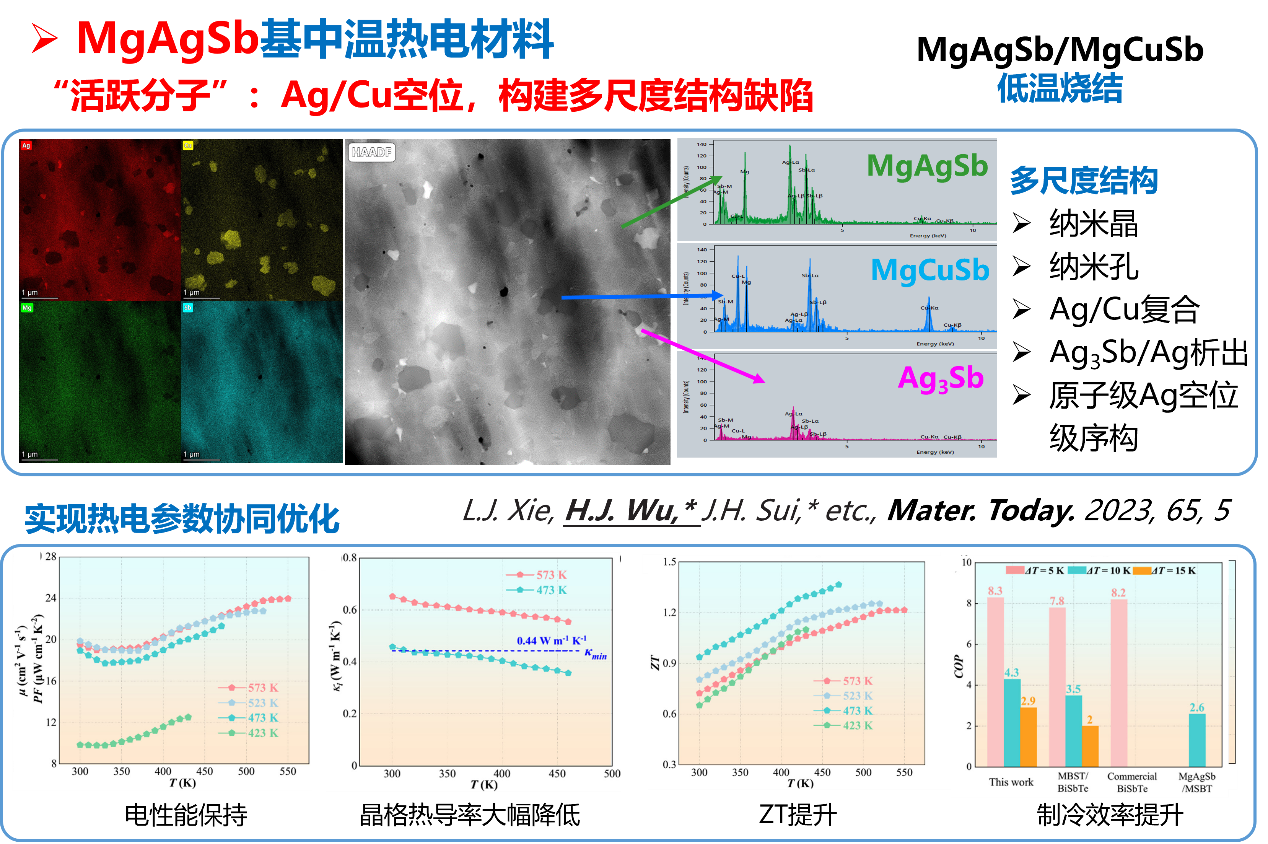 我校材料学院材料强度组武海军教授与哈尔滨工业大学研究团队通力合作,结合高能球磨合金化和热压烧结,在MgAgSb热电材料中同时构建了超细纳米晶(平均晶粒约为93nm)和多尺度纳米孔洞两种缺陷结构,获得了接近MgAgSb材料非晶极限的晶格热导率和超过目前所有MgAgSb基材料的热电优值。与高性能的n型Mg3.2(Bi, Sb)2热电材料组成的热电器件的制冷性能超过了先前报道的非Bi2Te3热电器件的性能。该研究创新性地将细晶结构和纳米多孔结构应用到热电制冷器件中,显著提升了制冷性能并避免了材料性能的高温衰减。