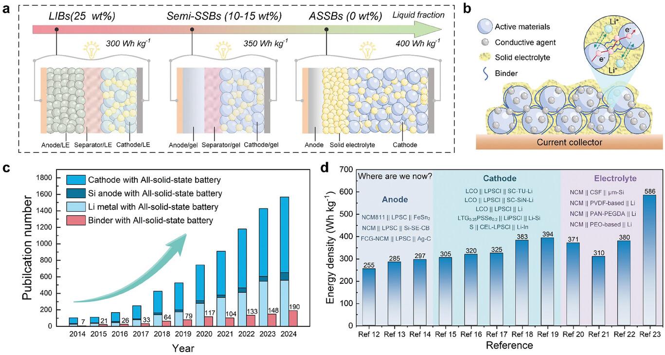 功能化粘结剂的开发对于上述全固态电池的开发也发挥着关键作用。近年来,宋江选教授团队围绕功能聚合物粘结剂分子设计开展了系统研究,提出并开发了离子-电子双导型、应力耗散型等新型粘结剂体系,近期受邀在国际知名期刊《先进材料》(Advanced Materials)上发表了题为《面向实际应用全固态电池的功能粘合剂现状》(Toward Practical All-Solid-State Batteries: Current Status of Functional Binders)的综述文章。该综述系统总结了高比能全固态电池中硅基负极、复合正极和固体电解质用粘结剂的设计原则,并针对各个部分提出了潜在挑战的解决策略。西安交通大学材料学院博士生毛财旺和硕士生董静静、李杰为本文共同第一作者。