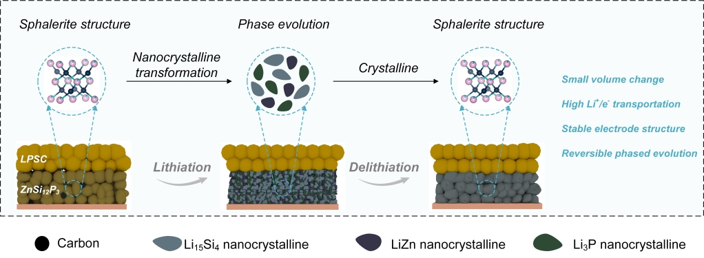 针对上述关键挑战,西安交通大学宋江选教授团队提出了一种具有可逆纳米晶相转变特性的低成本、高导电、高稳定性ZnSi12P3新型硅基负极材料。该材料在锂化过程中经电化学驱动可原位转化为Li15Si4、LiZn和Li3P纳米晶相,脱锂后可逆转变回原始的ZnSi12P3结构,从而有效缓解体积膨胀带来的应力并保持电极结构稳定性。该负极材料展现出高达2669 mAh/g的可逆比容量,并在与高镍三元正极匹配后,于3C高倍率条件下实现了超过3000次稳定循环。相关研究成果以《硅基负极中可逆的纳米晶相转变促进了全固态电池的稳定运行》(Reversible Nano Crystalline-Phase Transformation in Si-based Anode Enables Stable All-Solid-State Batteries)为题,发表于国际权威期刊《纳米快报》(Nano Letters)。西安交通大学材料学院博士生沈雪峰和硕士生王以和为本文共同第一作者。