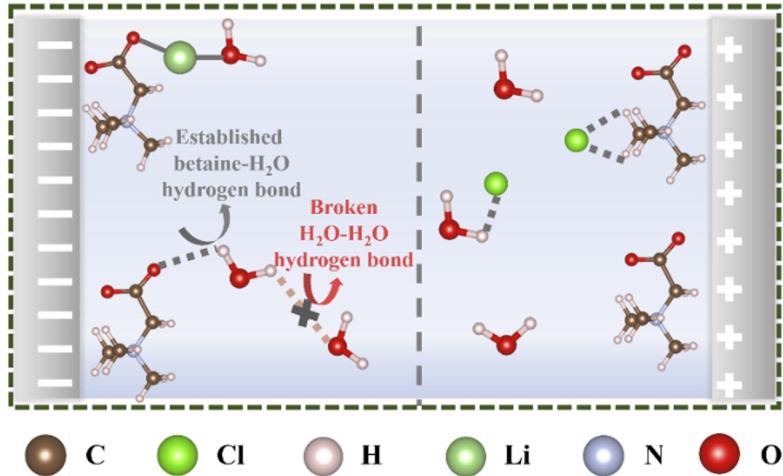 针对以上问题,李磊教授团队发展了一种新的策略,即通过两性离子功能的甜菜碱调控活性炭和水系电解液的固-液界面性质,以提高器件的工作电压和电极电荷存储能力,实现器件能量密度的巨大提升。甜菜碱均匀的包覆在活性炭表面,避免水系电解液和活性炭的直接接触。一方面,甜菜碱吸附电解液中的水,形成新的氢键,破坏水的原始氢键,从而降低活性炭附近电解液中水的活性,导致器件的工作电压从1.0 V大幅增加到1.4 V。另一方面,甜菜碱对电解液离子的吸附能力比活性炭强,导致器件电容在1 A g-1时由21.35 F g-1大幅增加到27.73 F g-1。它们的协同作用使超级电容器的能量密度从2.97 Wh kg-1提高到7.55 Wh kg-1,增加了接近2.5倍;功率密度从4.54 kW kg-1提高到6.82 kW kg-1,增加了1.5倍。同时,器件还具有良好的循环稳定性,在1.4 V和4 A g-1下循环10,000次后,电容保持率接近100%。除此之外,这种策略还极大地降低了器件的漏电流以及电压降。