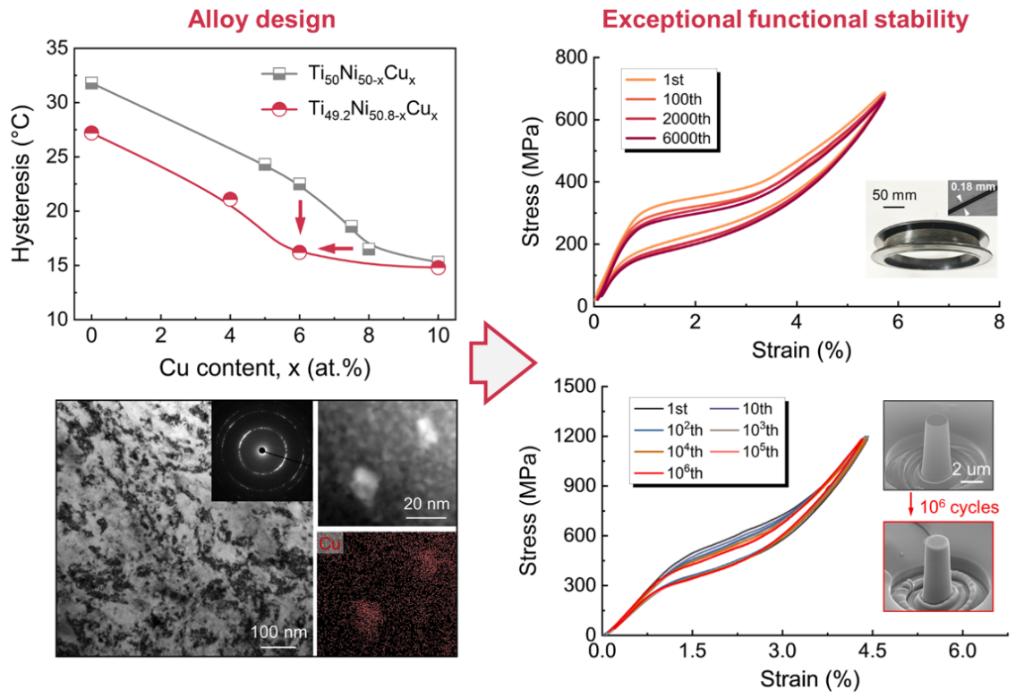 TiNi基合金因其优异的形状记忆效应和超弹性等特性,在航空航天、机器人、医疗器械和固态制冷等领域展现出广阔的应用前景。然而,传统TiNi基合金普遍面临大功能响应”与高循环稳定性难以兼顾的挑战,即在呈现较大可回复应变或显著弹热效应时,材料易发生性能衰减,严重制约其长期可靠应用。因此,如何在大功能响应与高循环稳定性之间实现协同优化,已成为形状记忆合金领域亟待突破的一个瓶颈问题。