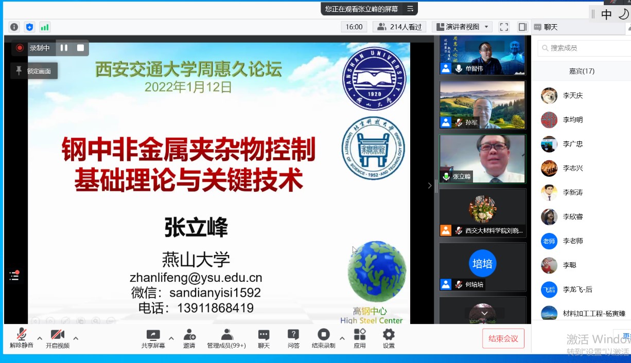 张立峰教授做客周惠久论坛线上讲座,以“钢中非金属夹渣物控制的基础理论与关键技术”为题,系统的介绍了钢中夹杂物的来源、特征、危害及其控制理论与关键技术等。报告受到广泛关注,来自西安交大及其他高校、科研院所等440余名师生在线参加学术报告会。本次讲座由单智伟院长主持。