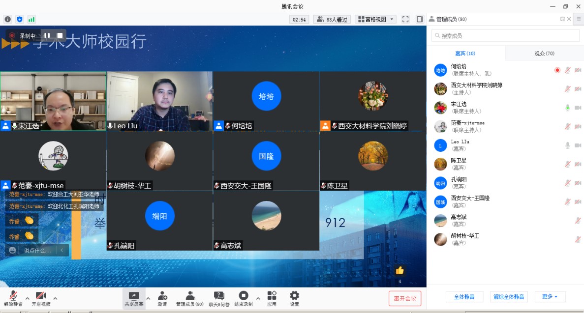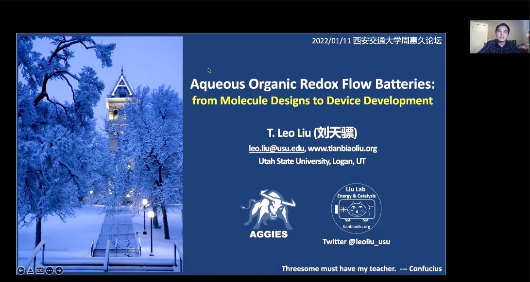 1月11日,受西安交通大学材料学院宋江选教授邀请,美国犹他州立大学化学和材料系刘天骠副教授做客周惠久论坛线上讲座,以《水系有机液流电池的储能应用》为题,为材料学院的师生作线上学术报告。