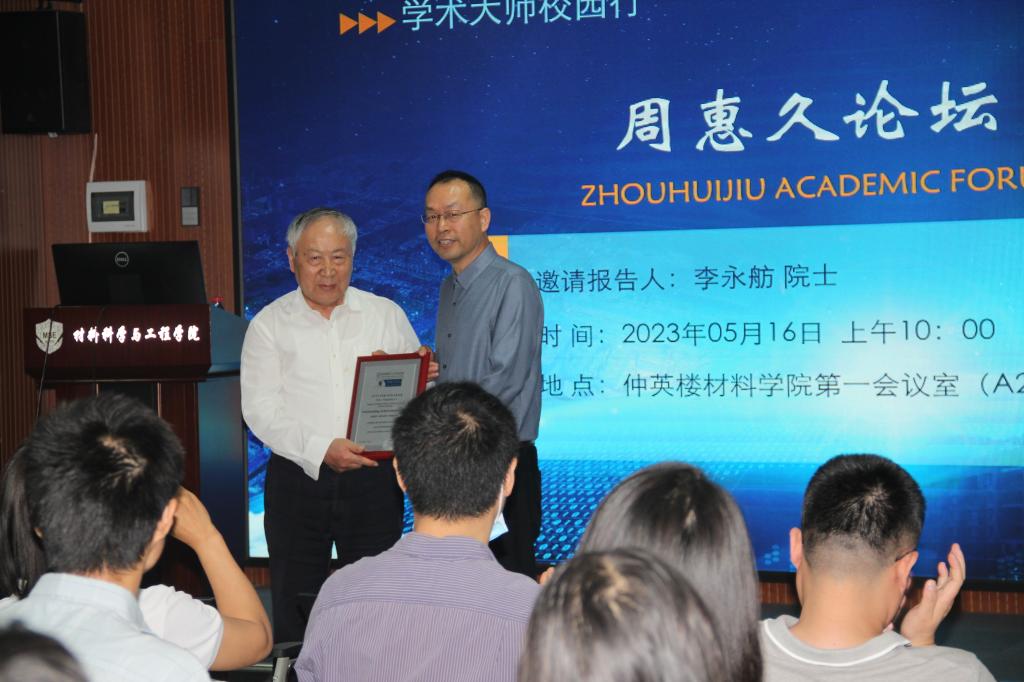 最后,李永舫根据老师同学们的提问进行一一解答,并且在报告结束时,由西安交通大学校长助理、材料学院院长单智伟教授为李院士颁发“周惠久论坛终身成就奖”荣誉证书。马伟教授表示希望今后与李院士有更多深入交流的机会,相互促进,共同提高材料研发水平。