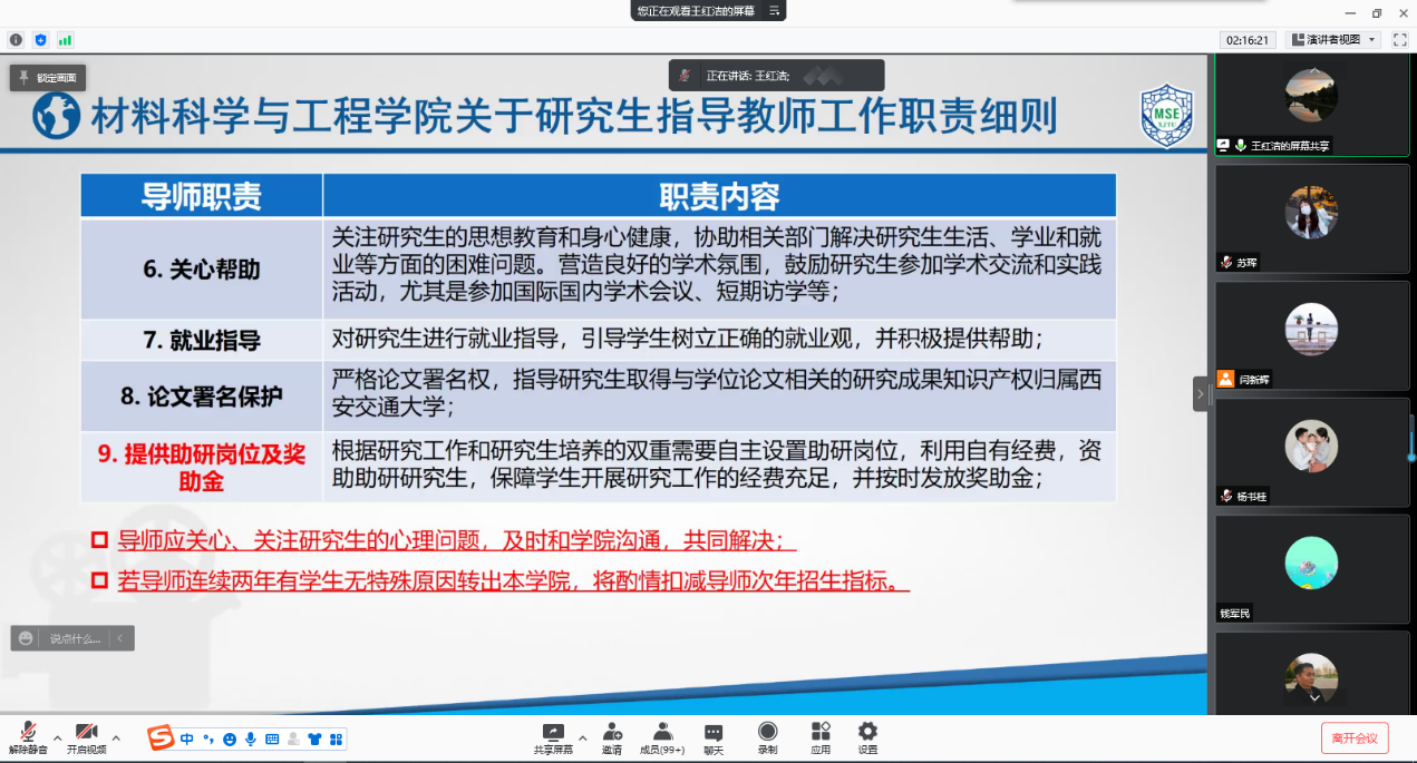 王红洁副院长强调研究生导师要重视并积极参与研究生指导教师的相关培训,明确导师的地位和作用,落实教师岗位职责。并对2021年度学院发布的研究生教学管理相关文件进行要点解读,主要包含研究生指导教师工作细责、硕士和博士研究生学位申请实施细则和导师资格认定三部分。