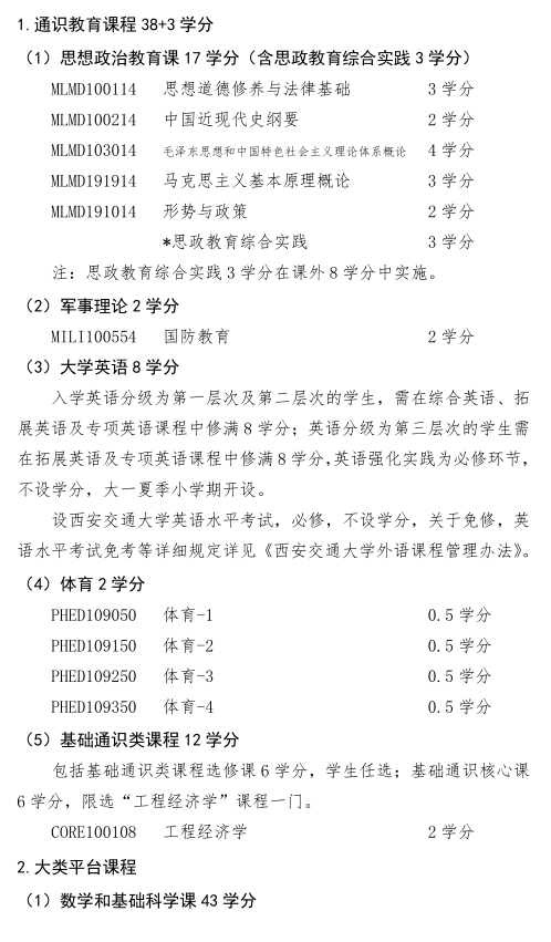 毕业条件:完成专业培养方案规定的160学分及课外实践8学分,军事训练考核合格,满足西安交通大学外语水平及体育达标要求,通过《国家学生体质健康标准》测试,准予毕业,可获得毕业证书;符合《西安交通大学本科生学籍管理与学位授予规定》的,可授予学位并颁发学位证书。