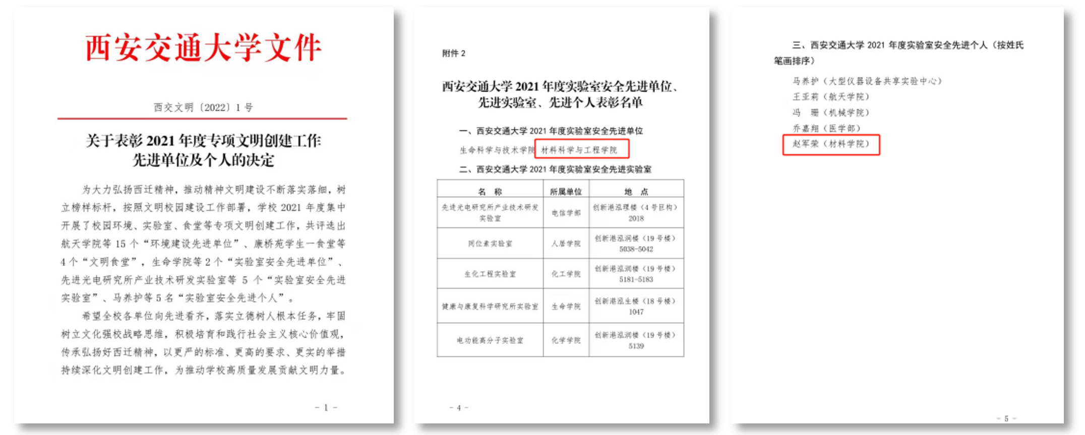 【凝材聚力 抗疫有料】材料学院喜获西安交通大学2021年度实验室安全先进单位和先进个人荣誉称号
