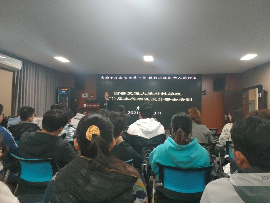 为确保2017级本科生顺利、如期完成毕业设计,3月3日下午,材料学院在仲英楼第一会议室举行本科毕业设计安全培训。此次培训旨在增强同学们的安全意识,提醒同学们在实验开始之前进行必要的危险性评估,实验过程中注意个人防护并遵守学院的各项规定,帮助同学们掌握实验室安全操作技能。材料学院副院长马飞、材料学院院长助理朱晓东和材料学院2017级全体本科生参加本次培训会。材料学院院办赵军荣主持本次活动。